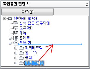 - 사용자화 탭에 있는 <파일 이름>의 사용자화 창에서 수정할 도구막대가 포함된 작업공간을 클릭합니다.