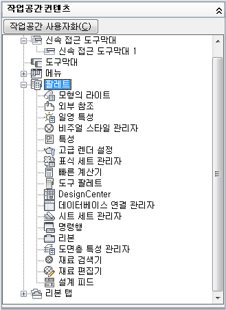 - 사용자화 탭에 있는 <파일 이름>의 사용자화 창에서 작업공간 노드 옆에 있는 더하기 기호(+)를 클릭하여 노드를 확장합니다.