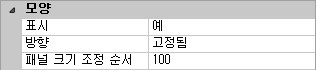 - 특성 창의 모양, 표시 상자에서 드롭다운 리스트를 클릭하고 예를 선택합니다.
