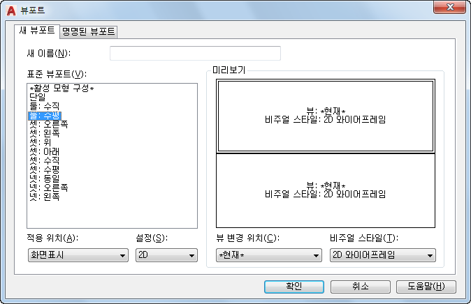새 모형 공간 뷰포트 구성의 이름을 지정합니다. 이름을 입력하지 않으면 뷰포트 구성이 적용은 되지만 저장되지는 않습니다. 뷰포트 구성이 저장되지 않으면 배치에서 사용할 수 없습니다.