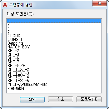이 대화상자는 선택한 도면층이 병합될 도면층을 지정합니다. 병합된 도면층은 이 대화상자에서 선택한 도면층의 특성을 상속합니다.