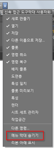 메뉴 막대는 빠른 액세스 도구 모음 드롭다운에서 사용할 수 있거나 CUI로 사용자 인터페이스를 사용자화하여 사용할 수 있습니다.