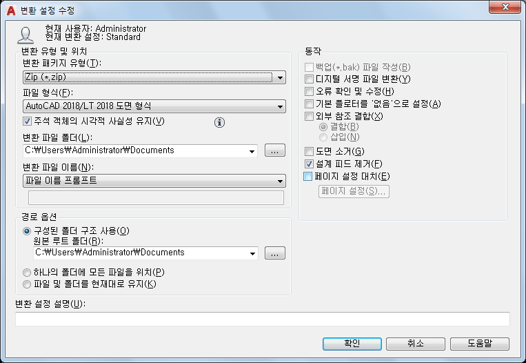 변환 패키지에 포함된 모든 도면이 변환될 파일 형식을 지정합니다. 드롭다운 리스트에서 도면 파일 형식을 선택할 수 있습니다.