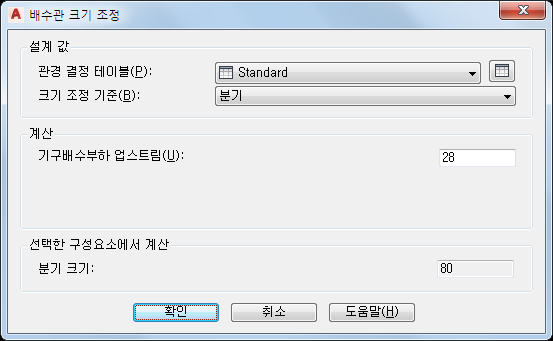 3. [이 도면 외부에서 연결하는 분기의 기구배수부하]에 대해 이전 단계에서 적어둔 기구배수부하 업스트림 값을 입력합니다. 선택한 런의 크기가 적절히 조정되고 관 크기 값이 그에 따라 업데이트됩니다.