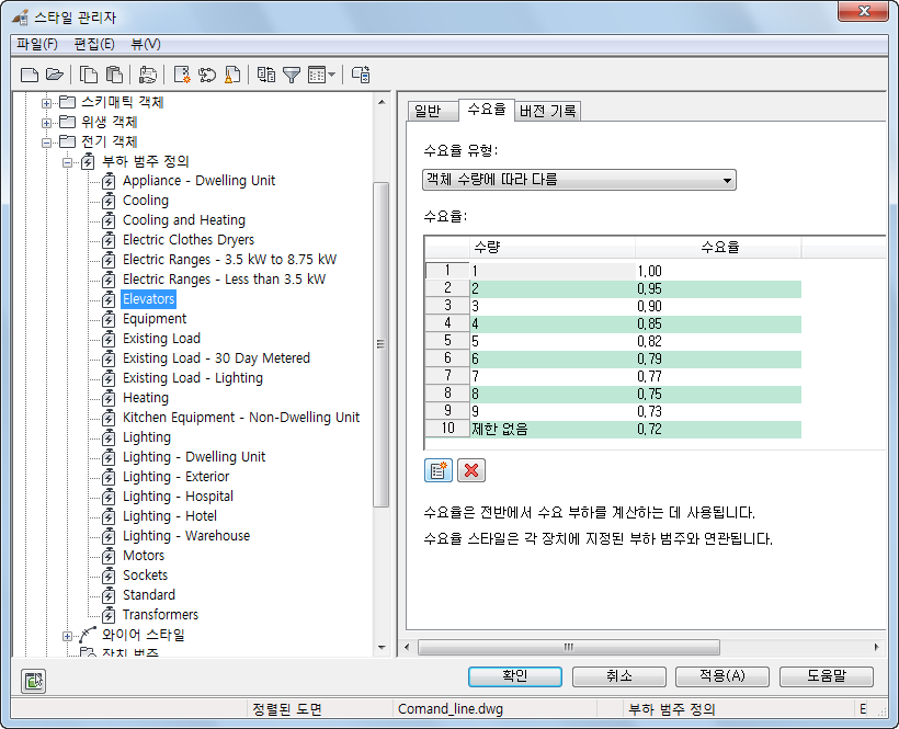 다른 예로 승강기처럼 수요율이 객체의 수량에 따라 달라지도록 설정된 경우, 최소 수요율 값은 72%(또는 .72)가 됩니다. 예상 부하는 600VA x 0.72(수요율 단위) = 432VA가 됩니다.