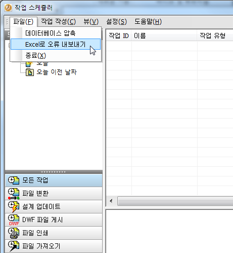 Excel로 오류 내보내기는 작업 스케쥴러 파일 메뉴와 선택한 작업의 상황에 맞는 메뉴에서 사용할 수 있습니다.