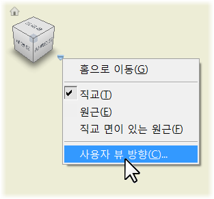 ViewCube를 마우스 오른쪽 버튼으로 클릭한 다음 사용자 뷰 방향을 클릭하여 사용자 뷰 환경을 시작합니다. 그런 다음 사용자 뷰 방향을 지정합니다.