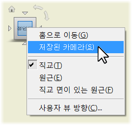 모형의 프리젠테이션 뷰를 기반으로 한 도면 뷰의 경우 프리젠테이션 파일(.ipn)에 저장된 카메라 설정에 액세스하고 해당 설정을 적용할 수 있습니다. ViewCube를 마우스 오른쪽 버튼으로 클릭하고 저장된 카메라를 클릭합니다.