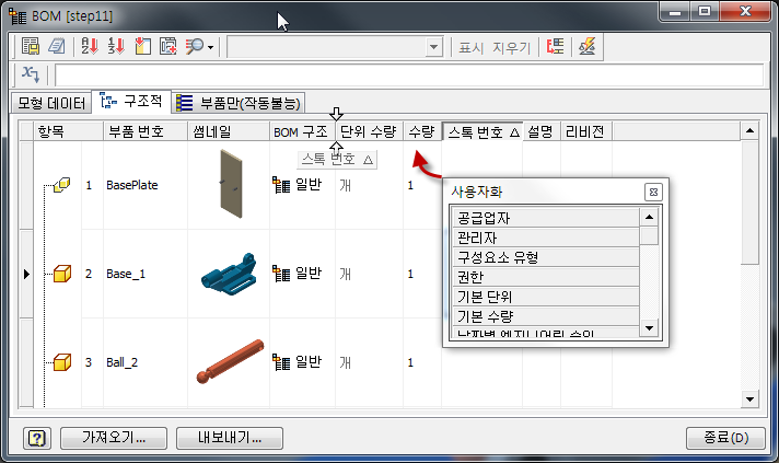 모형 모양 값이 선택 가능한 특성으로 추가됩니다. BOM 또는 부품 리스트에 모양 특성을 추가할 수 있습니다.