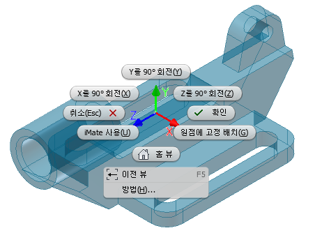새 조립품 응용프로그램 옵션을 지면에 여부를 지정합니다. 첫 번째 구성요소 원점에 배치됩니다. 이 옵션은 기본적으로 꺼져 있습니다. 구성요소를 원점에 고정하려면 상황에 맞는 메뉴를 사용합니다. 메뉴에는 구성요소를 조립품에 배치하기 전에 X, Y 또는Z축에 대해 90도 증분으로 회전하기 위한 새 옵션이 포함되어 있습니다.