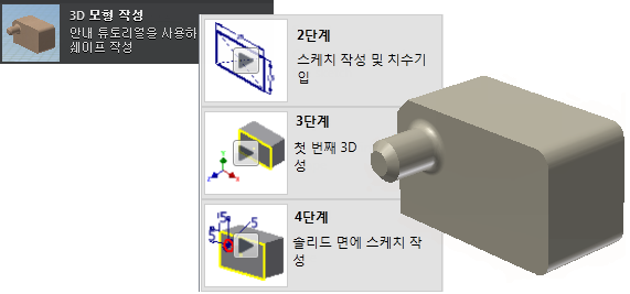 새 기본 기술 대화식 튜토리얼은 Inventor에서 3D 객체를 작성하기 위한 명령 및 워크플로우를 안내합니다.