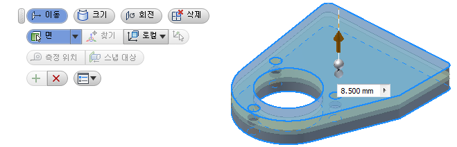 직접 편집을 통해 부품을 신속하게 편집할 수 있습니다. 형상을 직접 조작하여 모형 피쳐의 크기, 쉐이프 및/또는 위치를 조정할 수 있습니다. 직접 편집은 다음과 같은 경우 사용합니다.