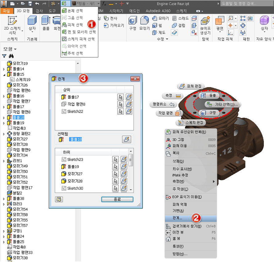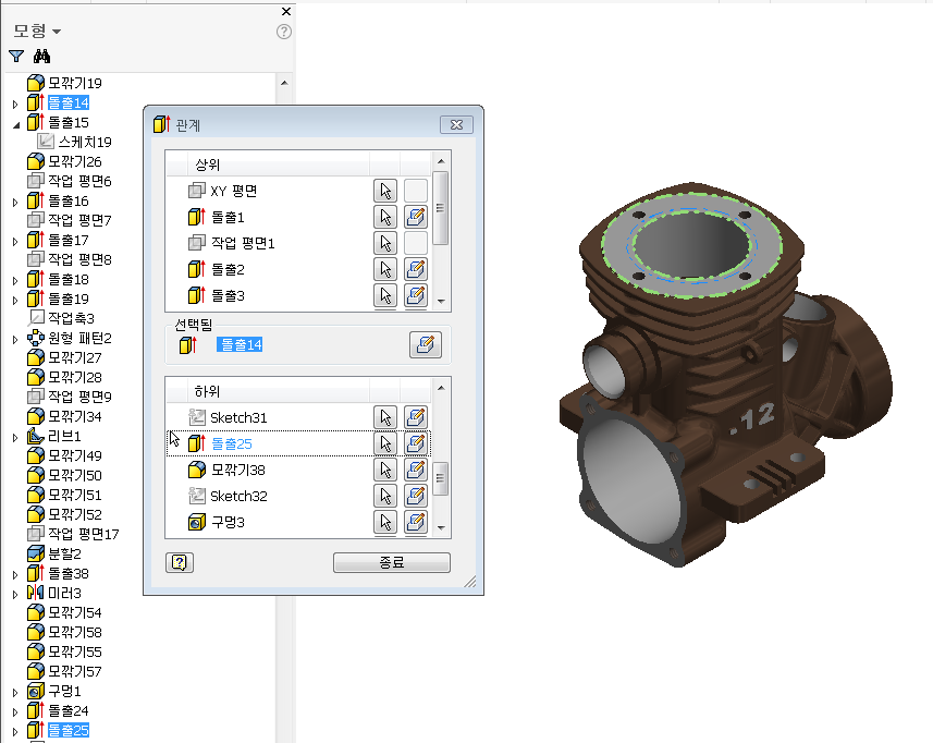 이제 부품 환경의 모형 검색기 또는 그래픽 창에서 부품에서 이 상위/하위 피쳐 관계에 쉽게 액세스할 수 있습니다. 이 새로운 대화식 대화상자에서는 부품 내에서 직접 피쳐 종속성을 볼 수 있습니다. 관계 대화상자에서