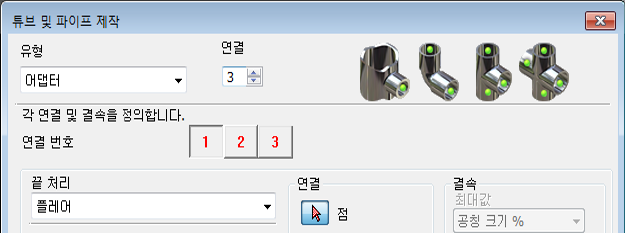 튜브 및 파이프 제작 대화상자에서 튜브 및 파이프 컨텐츠를 게시하는 동안 연결을 추가할 때 연결에 대해 마지막으로 사용한 끝 처리 설정이 자동으로 채워집니다.