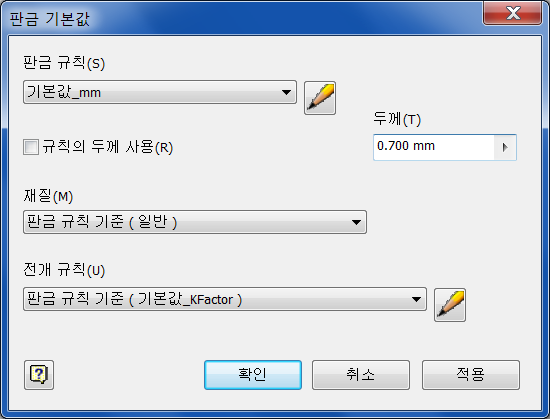 부품을 판금으로 변환할 때 기준 면을 선택하라는 메시지가 표시됩니다. 여기서 선택하면 Inventor에서 재질 두께를 측정할 수 있습니다. 면을 선택하면 판금 기본값 대화상자가 나타납니다. 측정된 두께는 두께 값 상자에 표시됩니다. 확인을 클릭하여 측정된 두께 값을 승인합니다.