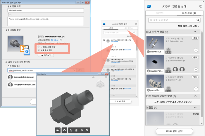 어디에서나 어떤 장치에서도 팀 및 다른 프로젝트 공동 작업자와 편리하게 설계를 검토할 수 있도록 Inventor 2016 R3에는 설계 공유 기능이 추가되었습니다. Inventor 2017의 여러 가지 향상된 기능으로 보다 빠르고 쉽게 공동 작업을 수행할 수 있습니다. 이제 공동 작업자와 피드백을 Inventor 내에서 직접 검토하고 관리할 수 있습니다. 새 컨트롤을 사용하여 모형 그래픽 외에도 부품 특성 및 부품 이름을 공유할 수 있으므로 보다 상세한 검토가 가능합니다.