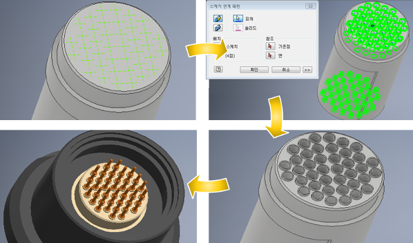 부품에 대한 스케치 기반 패턴과 유사한 조립품에 대한 스케치 기반 패턴화를 사용하여 부품을 스케치로 정의되는 복잡한 배열로 배치할 수 있습니다.