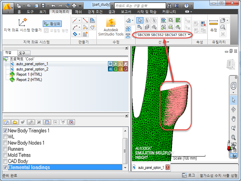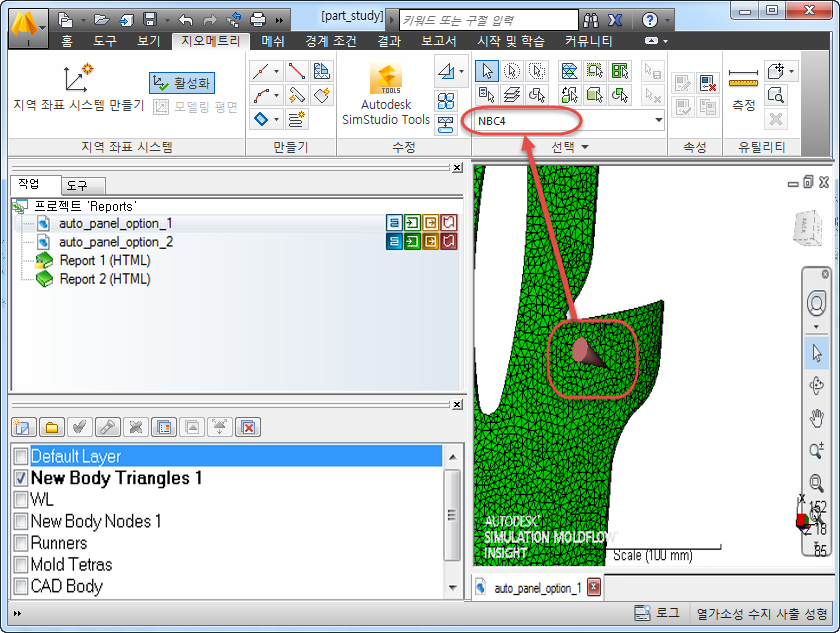 - 절점 경계 조건에는 하중이 제외된 모든 조건이 포함됩니다. 예를 들어 사출 주입점, 밸브 게이트, 가스 입구, 냉각수 입구 및 냉각수 출구가 모든 절점 경계 조건입니다. 가끔 제품 지오메트리에 적용되며 그렇지 않은 경우 메쉬에 적용됩니다. 각 절점 경계 조건에는 'NBC' 문자와 숫자로 구성된 고유한 식별 레이블이 있습니다. 경계 조건을 선택하면 해당 식별 번호가 선택 목록에 나타납니다.