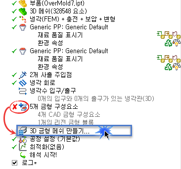CAD 지오메트리를 가져오고 금형 메쉬 도구를 사용하는 것은 냉각(FEM)이 포함된 순서에만 적용됩니다.