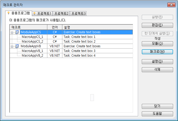매크로 관리자를 사용하여 매크로를 관리하고 실행할 수 있습니다.