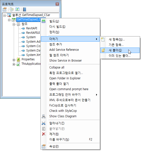 Revit IDE로 돌아갑니다. 이 예를 계속하려는 경우 프로젝트 탐색기에서 매크로에 대해 작성한 폴더를 마우스 오른쪽 버튼으로 클릭하고 메뉴에서 추가