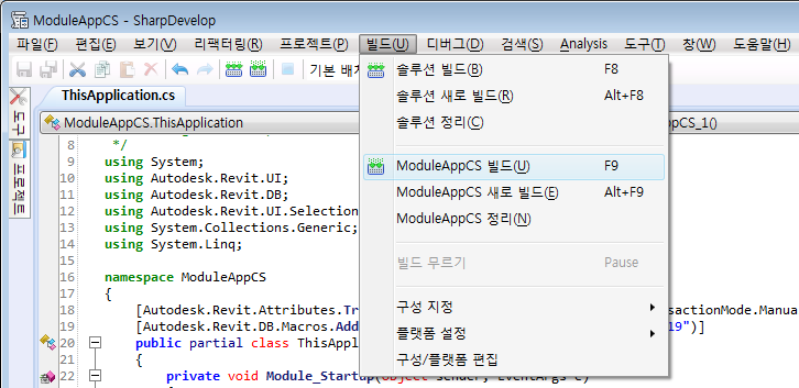 - Revit 매크로 IDE에서 작성 드롭다운 리스트의 매크로 관련 옵션을 선택합니다.