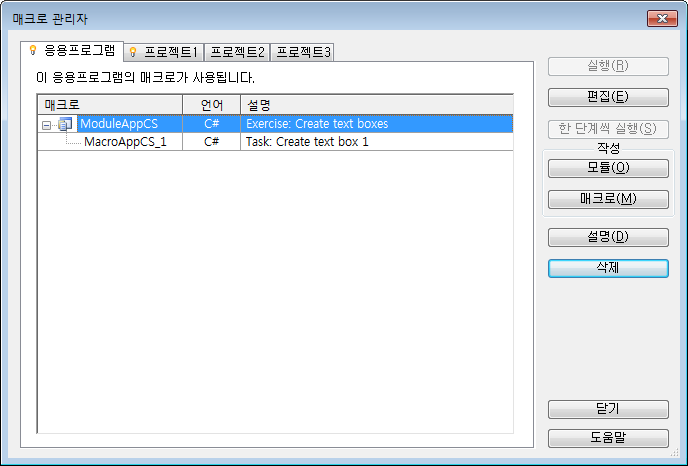 - 매크로 관리자에서 응용프로그램 레벨 매크로의 경우 응용프로그램 탭을, 문서 레벨 매크로의 경우 프로젝트 탭을 선택합니다.