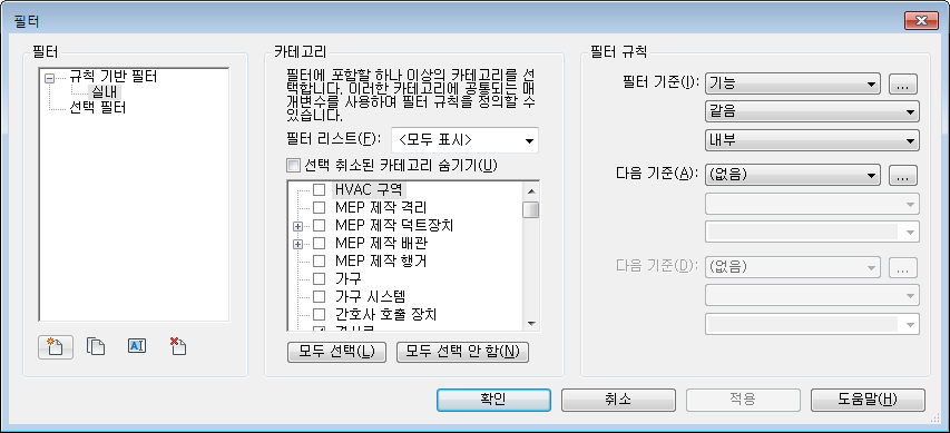 예: 2시간 방화 등급 문만을 표시하는 필터를 작성하려면 문 카테고리를 선택합니다. 2시간 방화 등급 문과 벽을 식별하는 필터를 작성하려면 문과 벽 카테고리를 선택합니다.