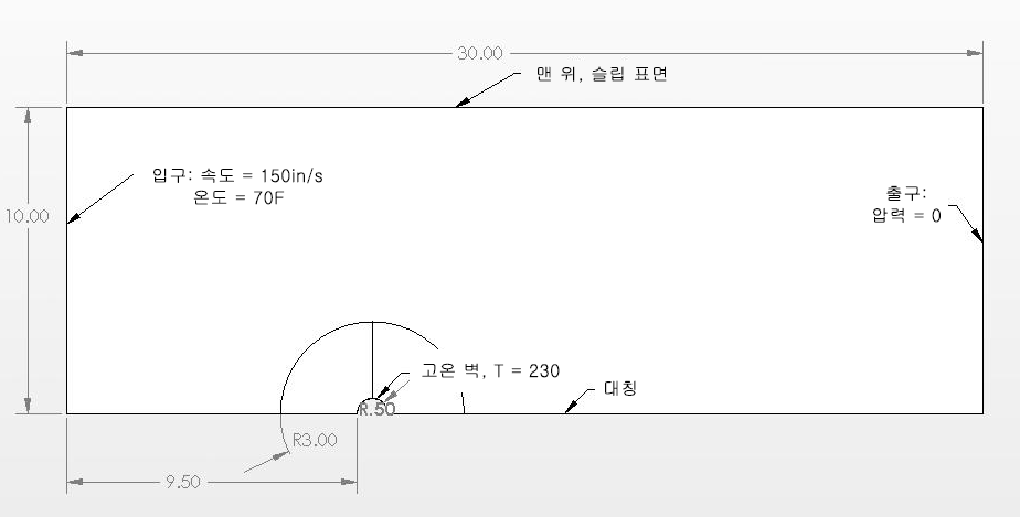 무한 길이를 갖는(따라서 2D로 근사됨) 원형 실린더가 1.0e5의 실린더 지름에 기반한 레이놀즈 수를 갖는 난류 물 흐름에 완전히 잠겨 있습니다. 실린더 벽의 온도는 고정되어 있습니다. 이 경우는 Autodesk® CFD의 물 흐름 및 열 전달 모델링 기능을 확인하기 위해 분석됩니다.