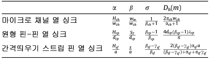 마이크로 채널 구성에 대한 상관 관계는 다음 형상 및 작동 조건을 따릅니다.