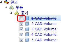 기본적으로 억제된 부품은 결과를 볼 때 표시되지 않습니다. 이를 표시하려면 설계 연구 막대를 열고 결과 분기의 재료 분기를 확장합니다. 표시할 각 부품 옆의 확인란을 선택합니다.