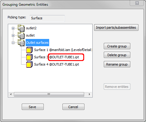 최상위 조립품(예: 부품 및 부분조립품) 내에 포함되지 않은 CAD 도면요소 그룹은 최상위 조립품을 시작해도 Autodesk® CFD에 자동으로 들어오지 않습니다. 그러한 그룹을 최상위 조립품에 신속하게 추가하려면 최상위 조립품이 활성 문서인지 확인하고 형상 도면요소 그룹화 대화상자에서 부품/부분조립품 가져오기를 클릭합니다.