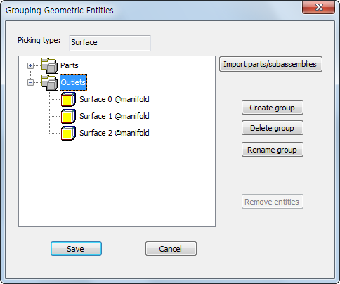 CAD 도면요소 그룹은 부품 또는 표면 집합으로, Autodesk® CFD와 함께 설치된 대화상자를 사용하여 CAD 시스템에서 작성됩니다. 또한 설계 연구 설정 및 작성의 지정을 자동화하는 편리한 방법을 제공합니다. Autodesk® CFD로 시작하면 CAD 도면요소 그룹이 시나리오에 추가되어 설계 연구 막대의 그룹 분기에 Autodesk® CFD 그룹으로 표시됩니다.