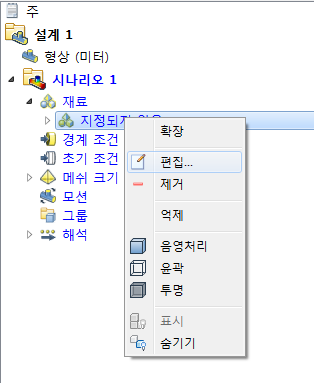 먼저 모형의 모든 부품에 재료를 지정합니다. 다음 몇 단계에서는 일부 재료 지정을 변경할 수 있습니다. 이 단계는 해석을 시작하기 전에 모든 부품에 재료가 지정되도록 하는 편리한 방법입니다.