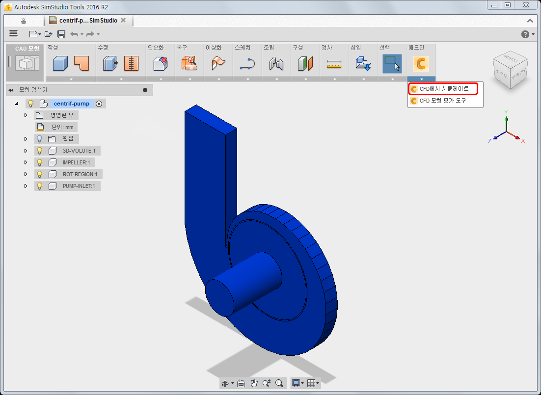 애드인 메뉴를 확장하고 CFD에서 시뮬레이트을 선택합니다.