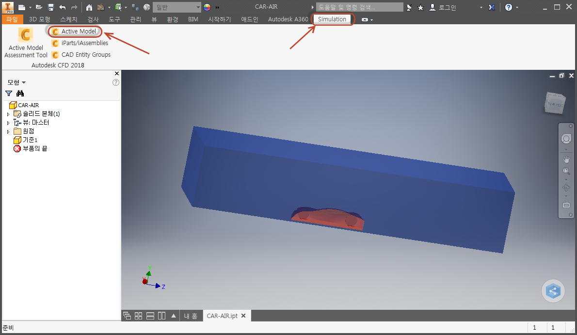 예를 들어 Autodesk® Inventor에서 시작하는 경우 시뮬레이션 및 활성 모형을 클릭합니다.