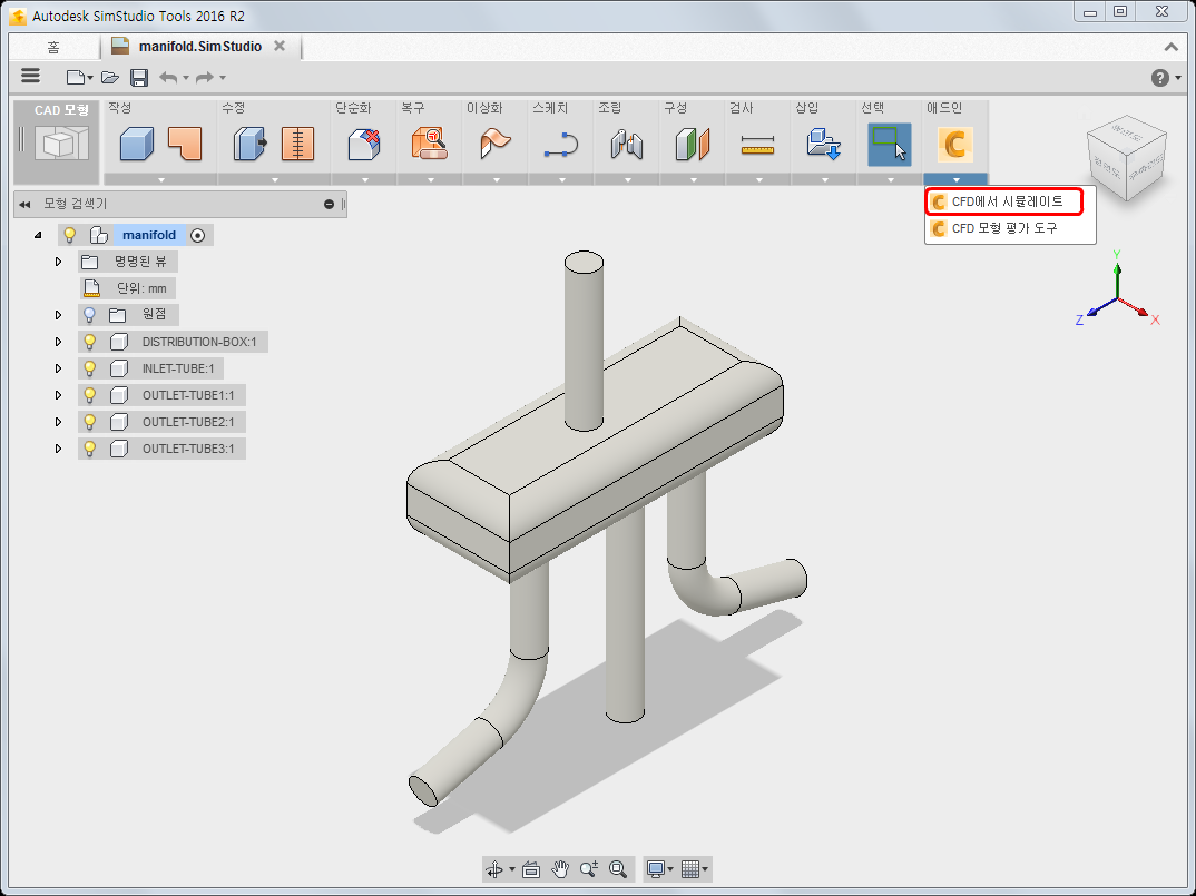 애드인 메뉴를 확장하고 CFD에서 시뮬레이트을 선택합니다.