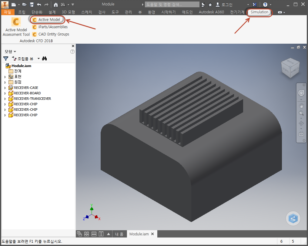 예를 들어 Autodesk® Inventor에서 시작하는 경우 시뮬레이션 및 활성 모형을 클릭합니다.