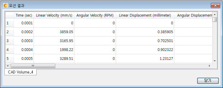 이 단계에서는 모션 결과 테이블을 사용하여 포핏에 대한 변위 및 힘의 시간 내역을 파악합니다. 이 테이블에는 이동하는 솔리드의 속도, 변위, 힘 및 토크의 전체 내역이 포함되어 있습니다.
