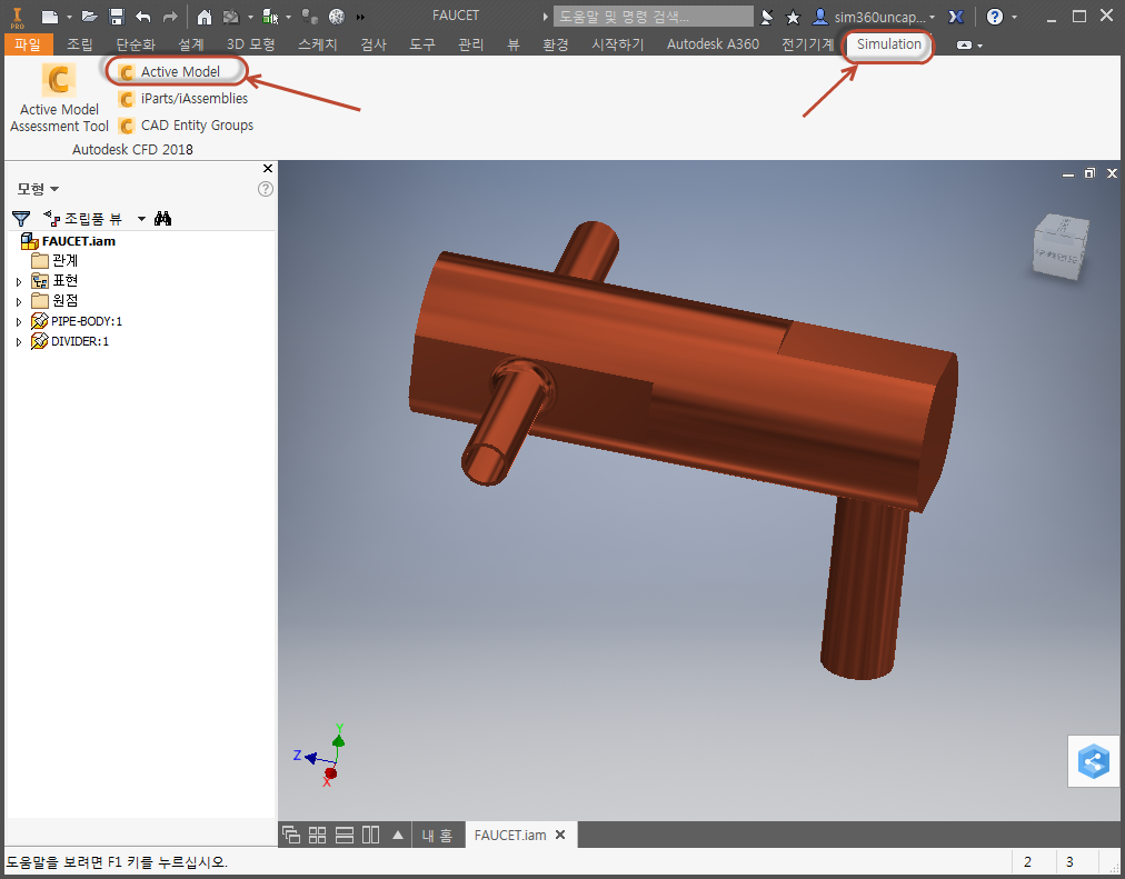 예를 들어 Autodesk® Inventor에서 시작하는 경우 시뮬레이션 및 활성 모형을 클릭합니다.