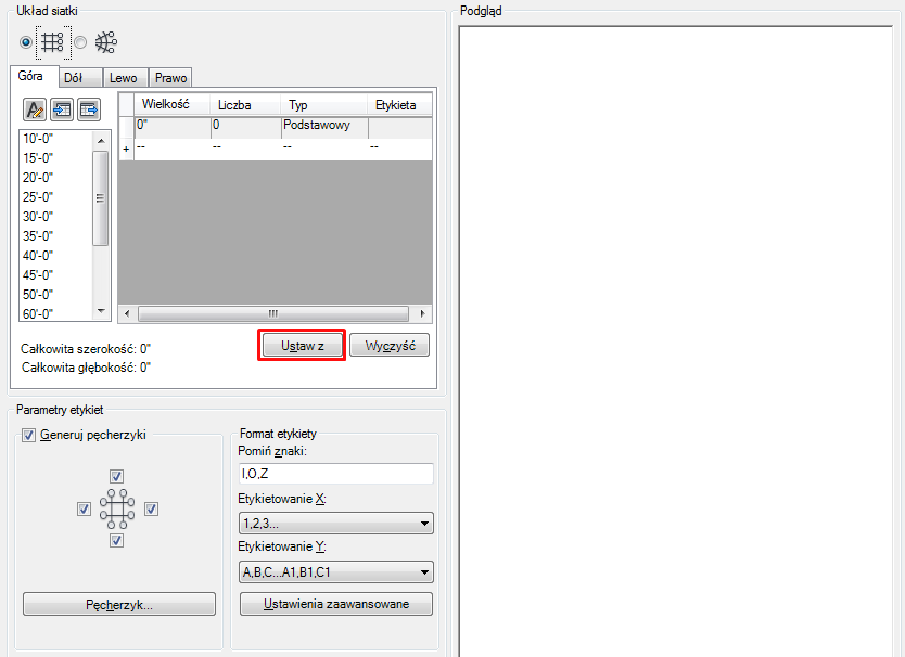 W oknie dialogowym Siatka słupów wyodrębnione dane zaznaczonej siatki są wyświetlane w tabeli Układ siatki. Zostanie również wygenerowany i wyświetlony podgląd wybranej siatki.