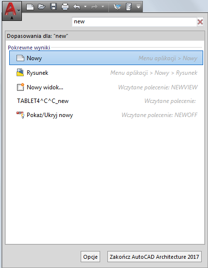 Menu aplikacji umożliwia wyszukanie polecenia, a następnie wybranie go z listy zgodnych pozycji. Wyniki wyszukiwania pobierane są z następujących miejsc: