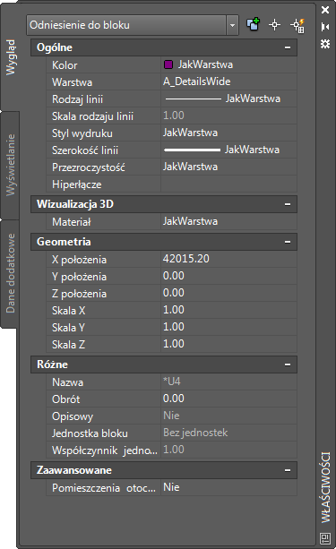 Na następującym obrazie przedstawiono kartę Dane dodatkowe palety Właściwości dla bloku szczegółu betonowego elementu murarskiego.