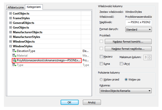W oknie dialogowym Dodaj kolumnę, w obszarze Style okien wybierz opcję Przybliżona szerokość otworu narożnego — psotn1 x psotn2.