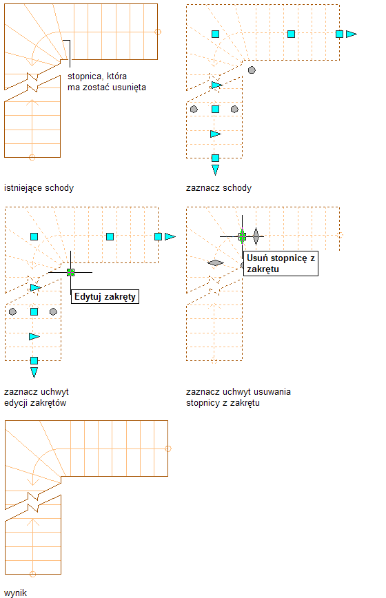 Wybrana stopnica zostanie usunięta z zakrętu zabiegowego. Jeśli usuwanie stopnic będzie kontynuowane, na schodach może zostać wyświetlona ikona etykiety rozwiązania. Użyj polecenia Cofaj, aby odtworzyć poprzednią konfigurację stopnic.