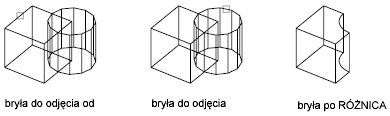 Program odejmuje obiekty drugiego zbioru wskazań od obiektów pierwszego. Tworzona jest nowa pojedyncza bryła lub powierzchnia 3D.