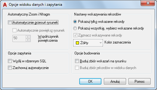 Steruje sposobem wyświetlania połączonych obiektów w bieżącym rysunku po wybraniu odpowiadających im rekordów w oknie Widok danych.
