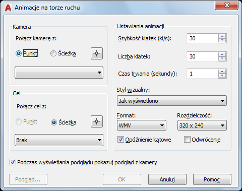 Łączy kamerę ze ścieżką ruchu na rysunku. Ścieżka może być linią, łukiem, łukiem eliptycznym, okręgiem, polilinią, polilinią 3D lub splajnem.