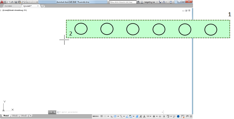 Po włączeniu zmiennej systemowej SELECTIONOFFSCREEN obiekty, które są poza ekranem (punkt 1 na rysunku jest poza głównym ekranem), są uwzględniane w wyborze.