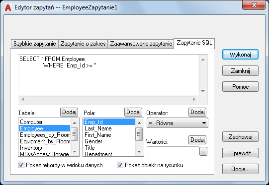 Zakładka Zapytanie SQL udostępnia okno edytora zapytań, w którym można wpisać polecenie SQL oraz zestaw narzędzi pomagających w tworzeniu nowego zapytania. Ponieważ niektóre systemy zarządzania bazą danych nie są w pełni zgodne ze standardem SQL 92, sprawdź w dokumentacji systemu, jakie polecenia SQL są prawidłowe dla danej bazy danych.
